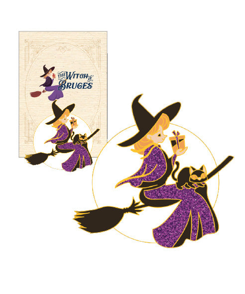 EN | Embrace the magic of Bruges with our enchanting Witch of Bruges pin badge. This spellbinding design features a whimsical witch in shimmering purple glitter, complete with her trusty black cat companion. Perfect for adding a touch of Belgian mystique to your jacket, bag, or hat. 45 mm